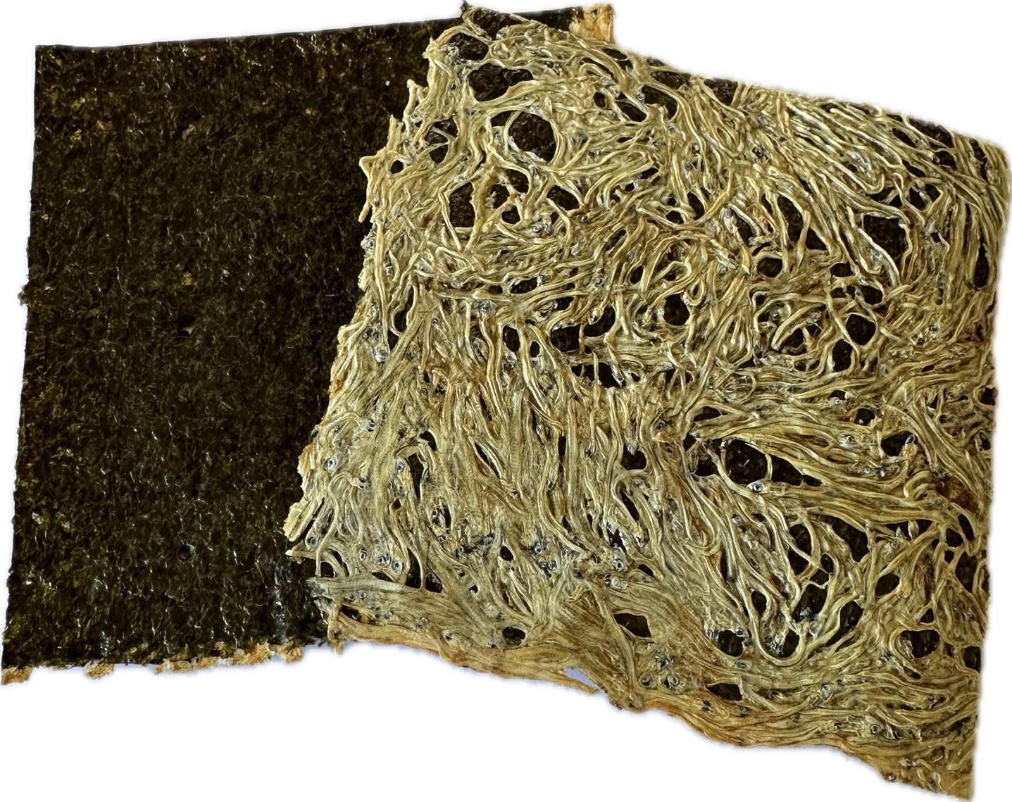 たたみいわしに焼きのりを合わせて炙りました。そのままお菓子感覚で食べられる商品です。海苔の磯の香ばしさとたたみいわしの相性の良い風味が特徴です。おやつやおつまみ、料理のトッピングとしてもご使用できます。