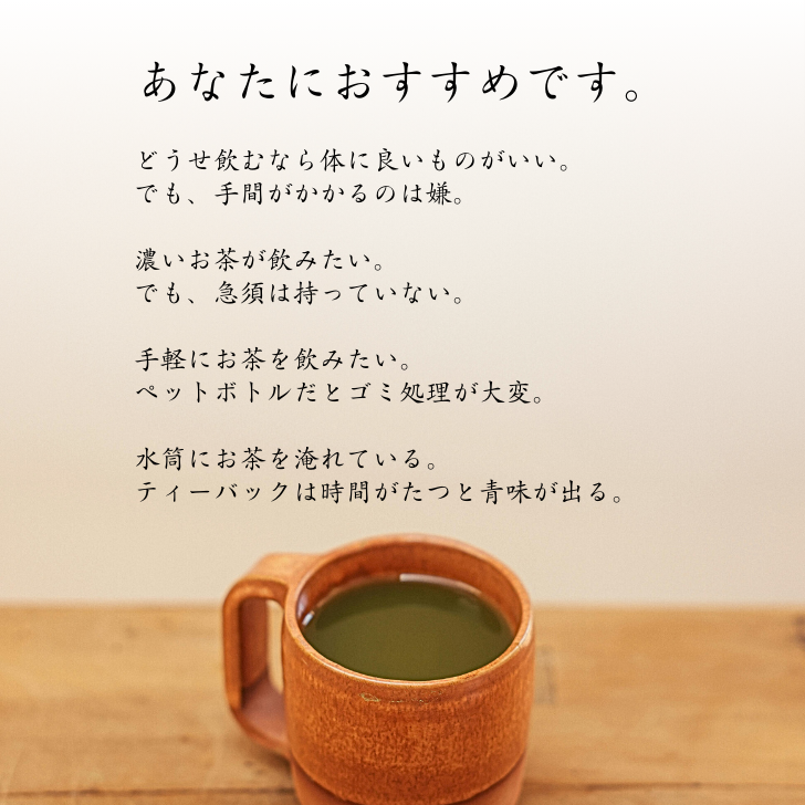 - 一般的な煎茶に比べて、滋味を多く含む深蒸し茶は和菓子にも洋菓子にも合う味わいになります。普段飲みはもちろん、お祝いの席や贈答品としてもおすすめです。急須がなくても、マイボトルやマグカップで簡単に本格的な味が楽しめます。焼酎の割材、お菓子作りの材料としてもご利用いただけます。
