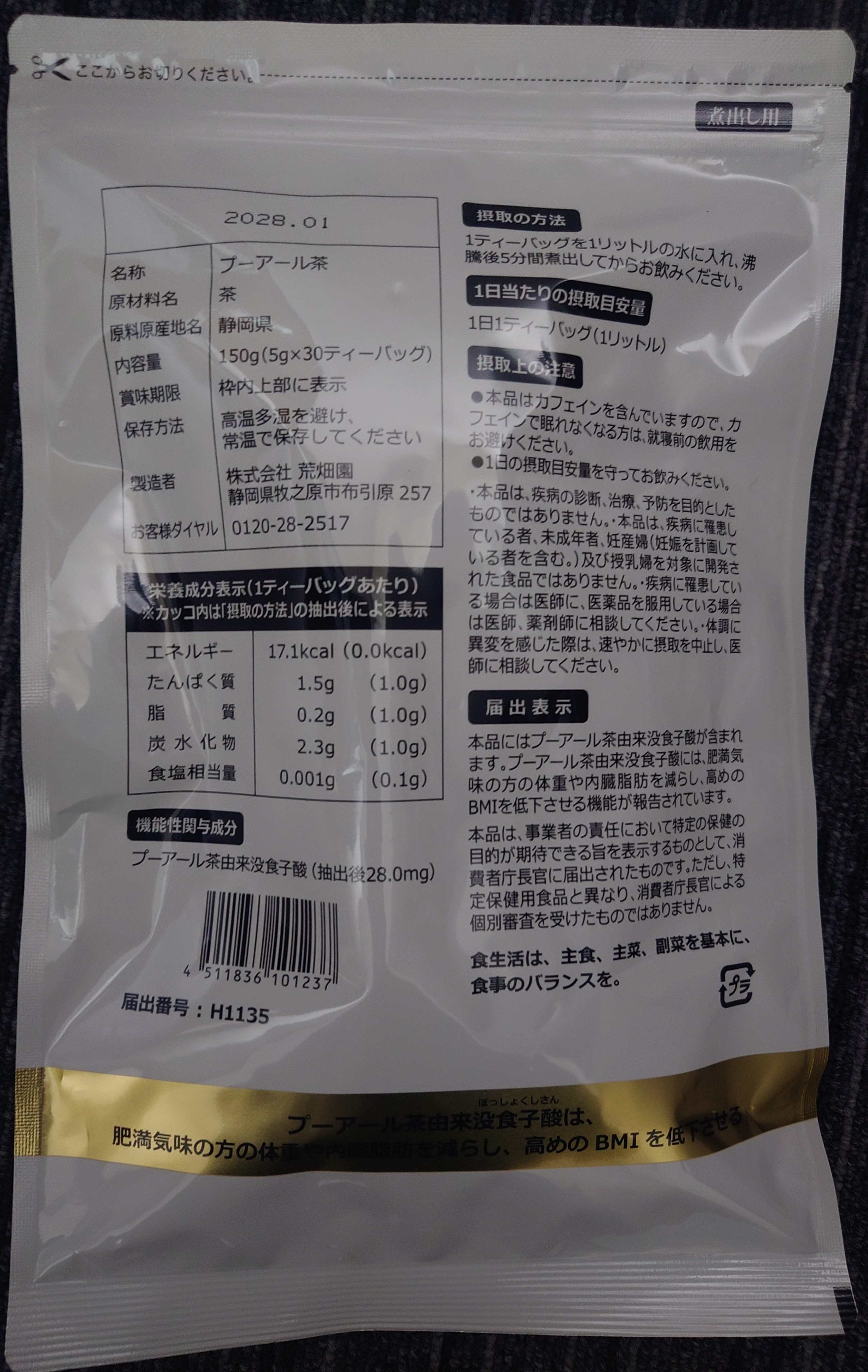 純国産のプーアール茶です。没食子酸が、体重や内臓脂肪を減らし、高めのBMIを低下させる機能性表示食品のお茶です。中国産と比べ、クセがなくまろやかで、気品のある香りが特徴です。
