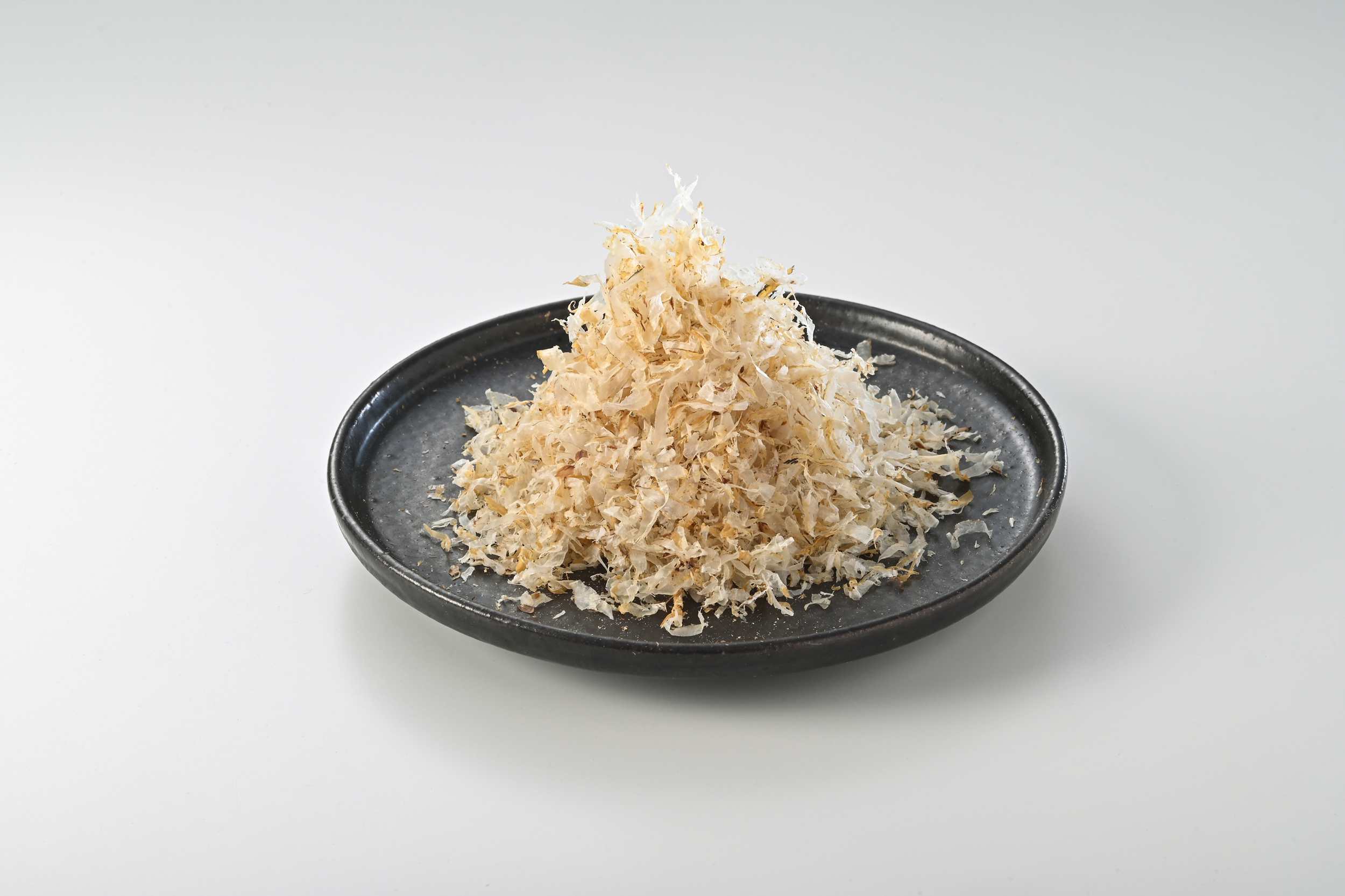 - 普通のいわし削りは、厚さ0.15mm前後ですが、このふわふわ食べるいわし削りは、厚さ0.01~0.03mmで極限に近い薄さをだし、食感を大事にしました。
